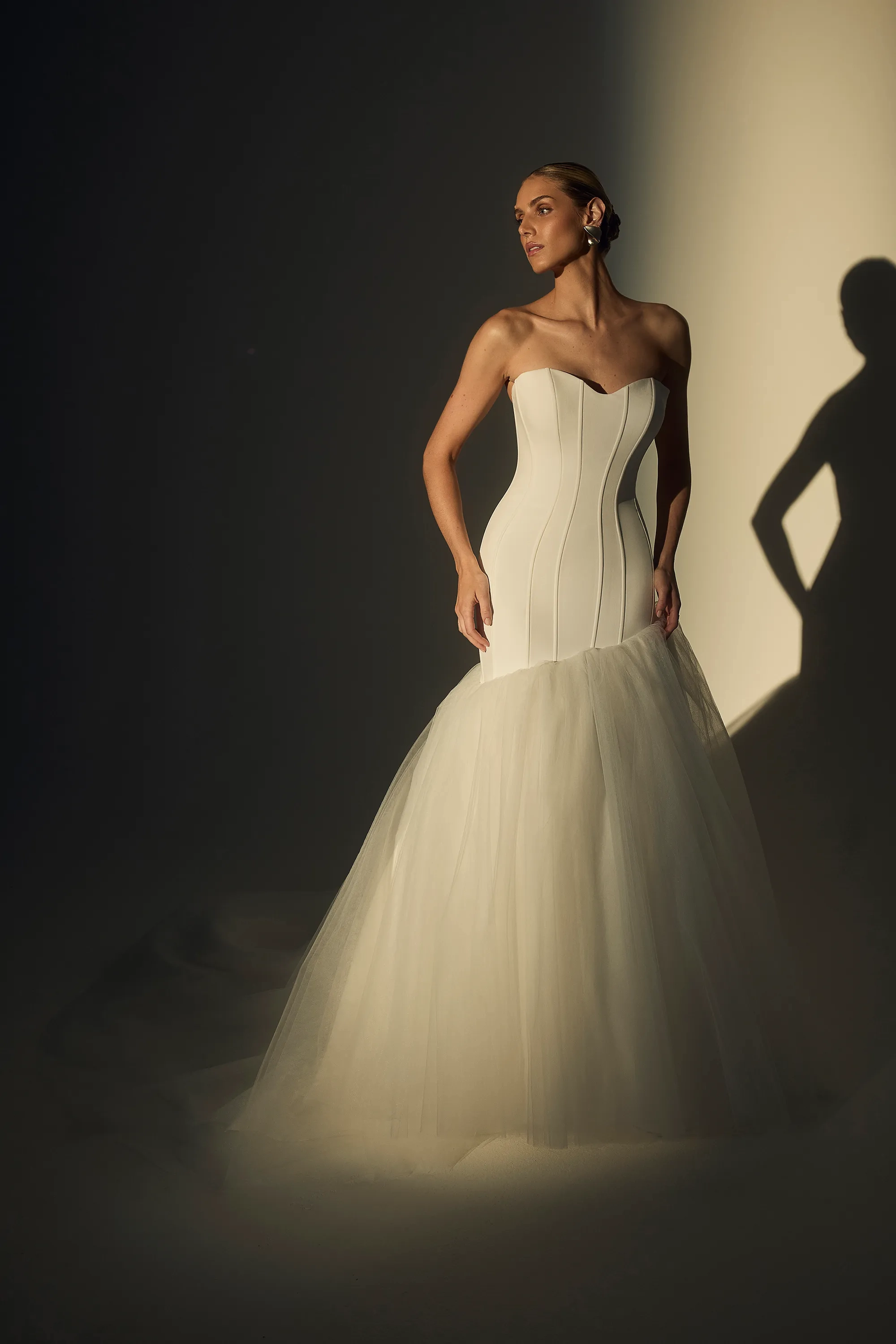 Striking and sculptural, Style LE167 is a mermaid gown designed to celebrate the feminine form with confidence and grace. This strapless silhouette features a classic sweetheart neckline and a fully boned bodice that contours the torso from neckline to hem, offering supportive structure and couture shaping. The princess waistline elongates the frame, flowing seamlessly into a voluminous 76-inch tulle train that adds both softness and dramatic movement. Crafted from Italian Crepe Double Knit with a smooth lining, this gown blends figure-hugging design with timeless elegance, making it a captivating choice for the modern bride seeking romance and refinement. Finished with an invisible back zip closure, LE167 pairs beautifully with a sleek bun and statement studs for a chic, editorial bridal moment.