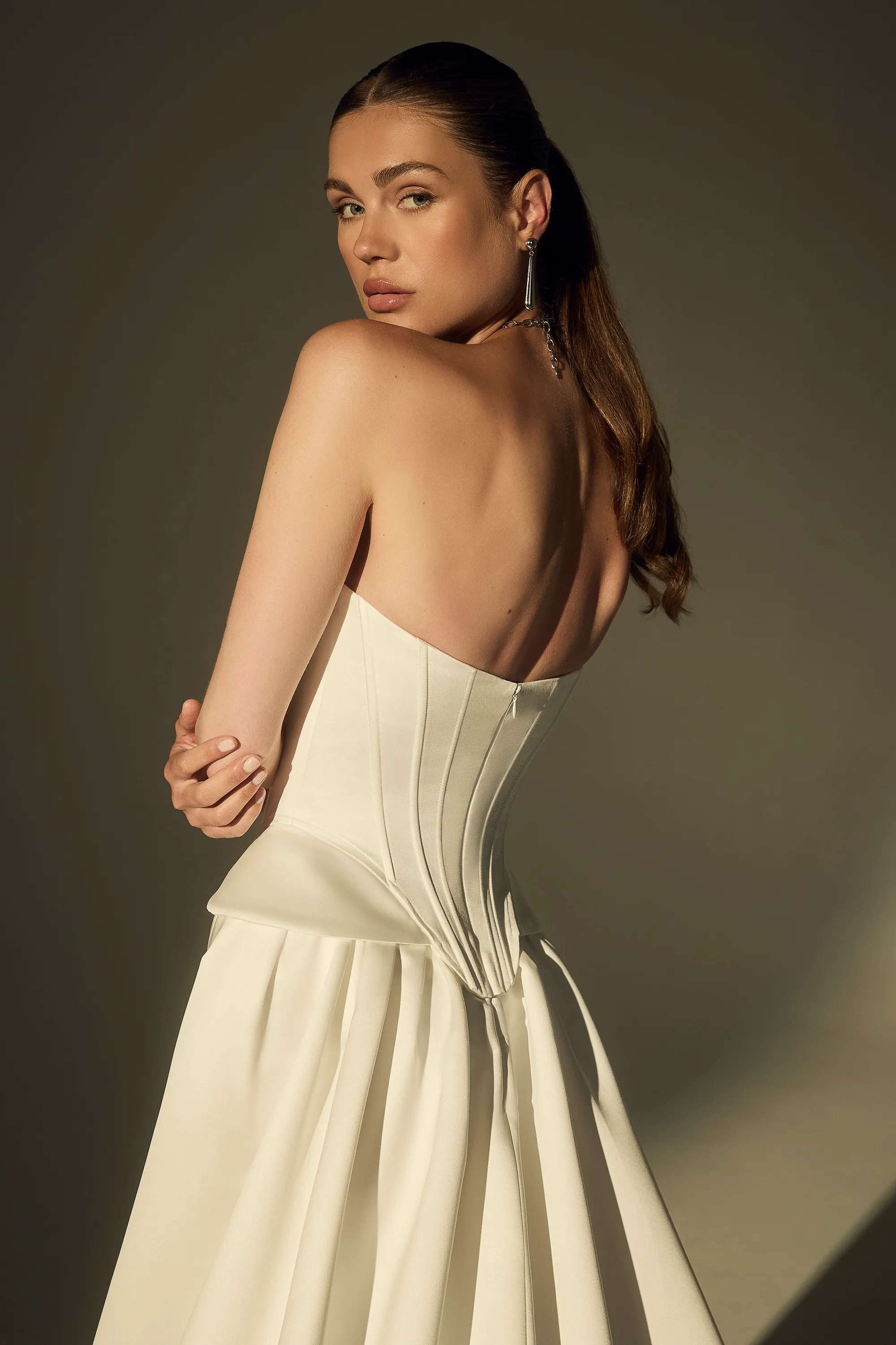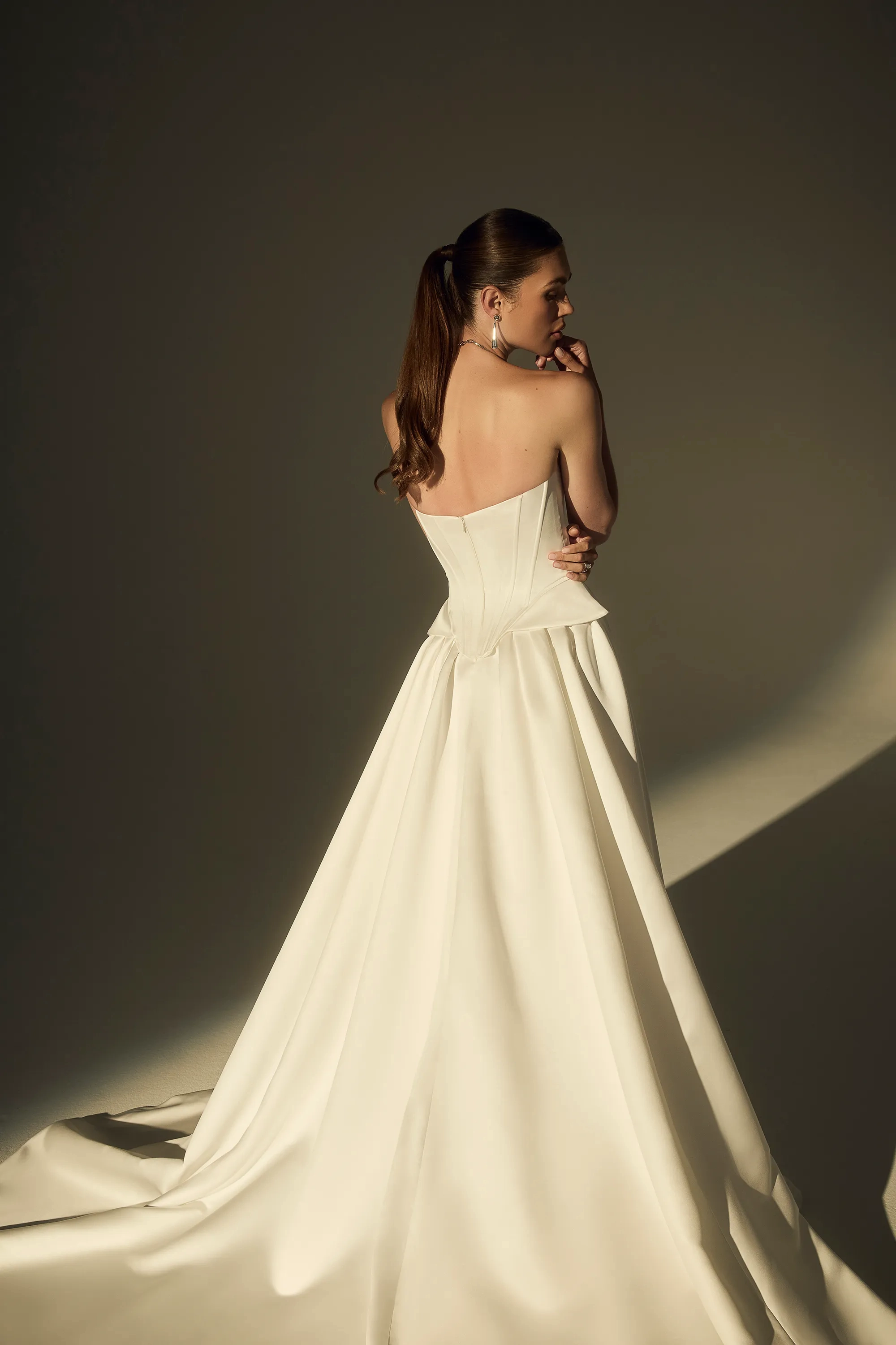 Victorian style meets its modern muse in LE169, an architectural A-line gown designed for the bride who commands attention. A pointed scoop neckline and exposed corset boning sculpt the figure with regal precision, while hip-sculpting points add a touch of historical couture flair. A daring thigh-high slit introduces a bold, fashion-forward twist, bringing soft movement to the luminous satin skirt as it flows into a sweeping 76-inch train. Finished with a center back zip closure, this gown blends sophistication, statuesque presence, and unapologetic modernity—perfect for the timeless romantic with a hint of rebelliousness. Pair with sleek heels and a minimalist veil to highlight its sculptural beauty.