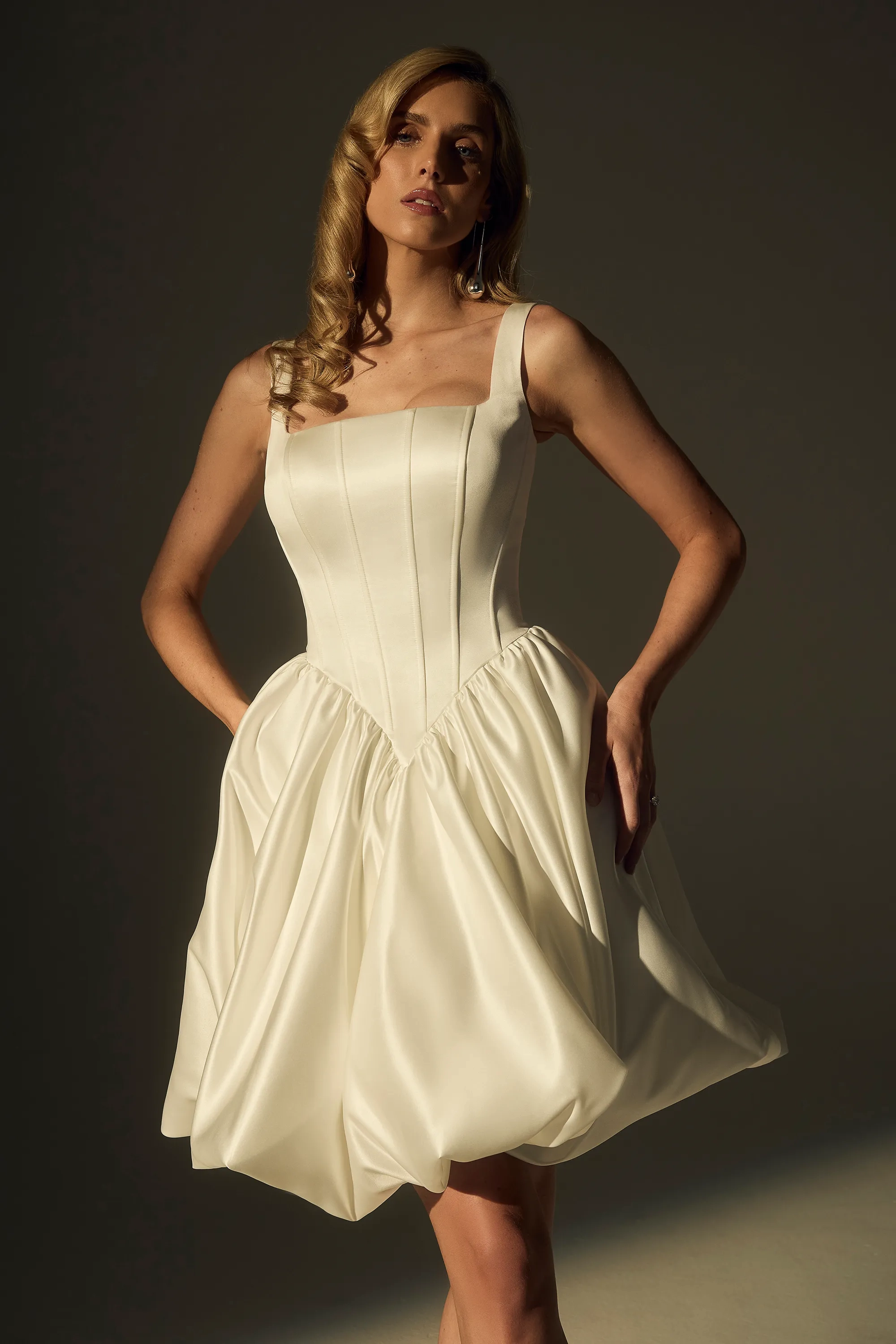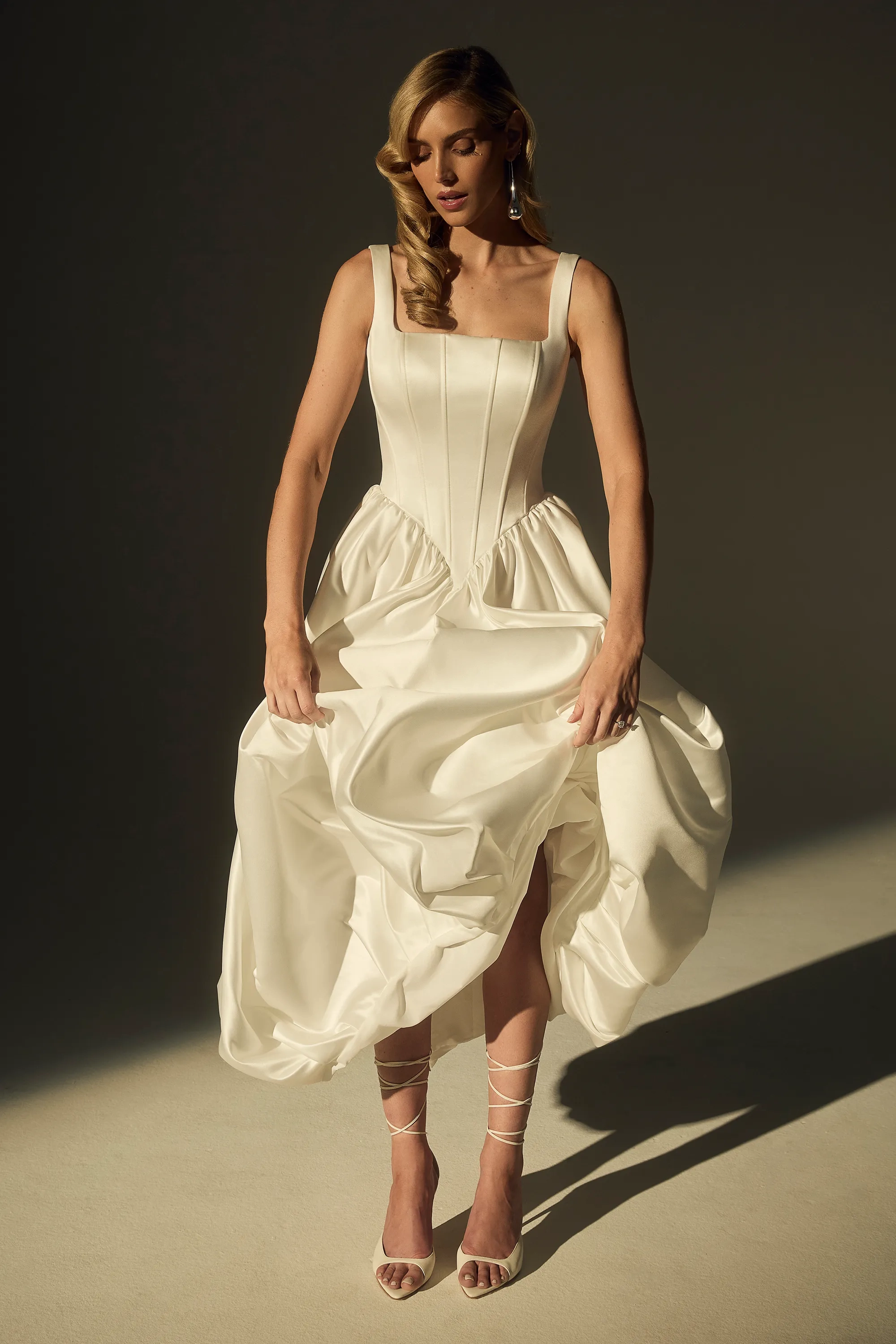 There’s something unforgettable about LE171-2, a modern A-line gown that blends timeless elegance with sculptural sophistication. Crafted from sleek perfecting satin, its refined silhouette features a classic natural waistline for a traditional touch, while the asymmetrical one-shoulder neckline and ruched bodice introduce soft movement and architectural drama. A bold satin rose blooms at the bodice, creating a romantic focal point that draws the eye from every angle. Graceful yet daring, LE171-2 is designed for the bride who wants to embody effortless beauty with a fashion-forward edge, perfectly complemented by satin gloves or a sleek veil for an added touch of contemporary romance.