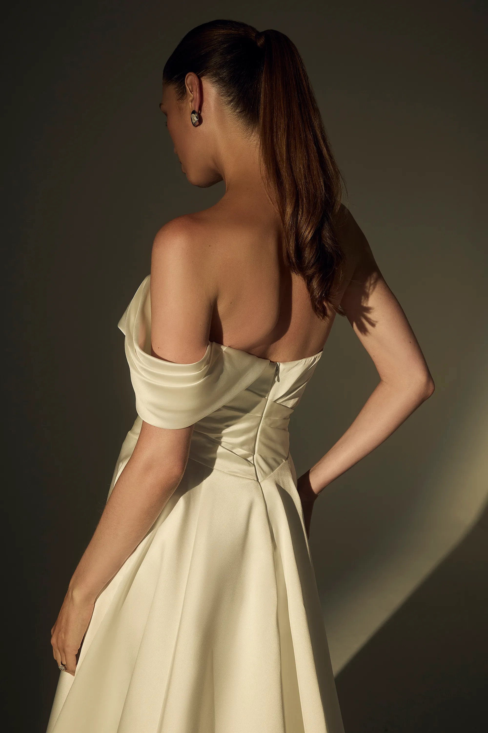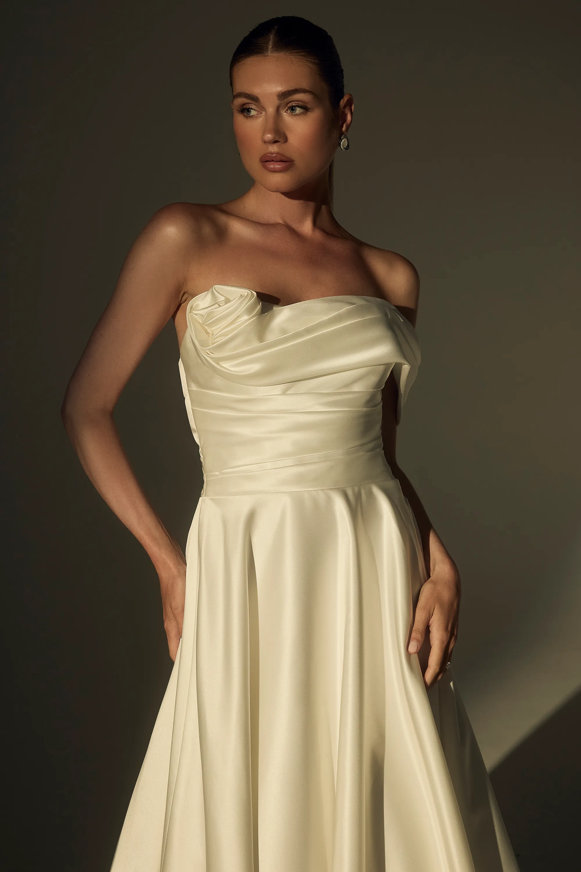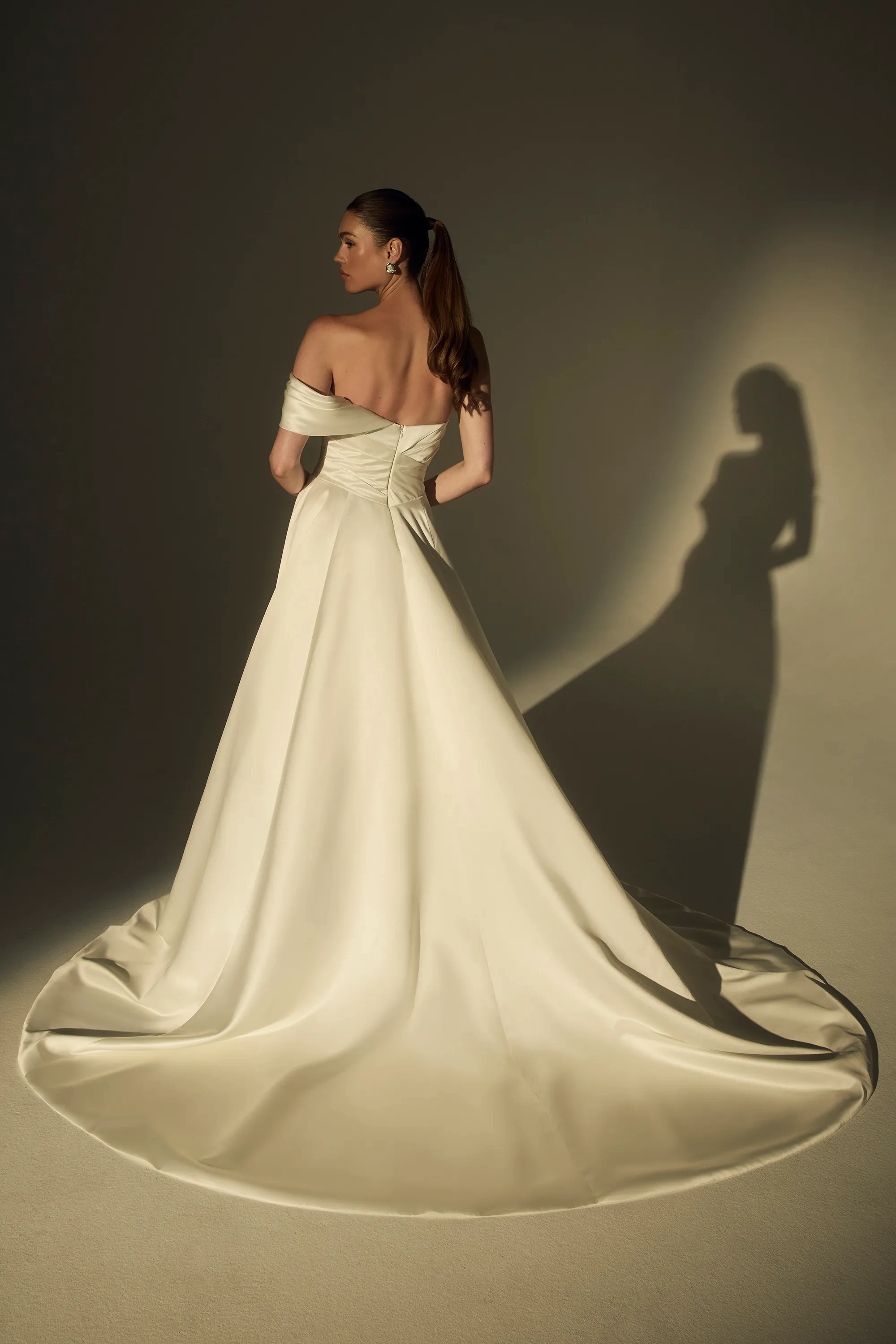 There’s something unforgettable about LE171-2, a modern A-line gown that blends timeless elegance with sculptural sophistication. Crafted from sleek perfecting satin, its refined silhouette features a classic natural waistline for a traditional touch, while the asymmetrical one-shoulder neckline and ruched bodice introduce soft movement and architectural drama. A bold satin rose blooms at the bodice, creating a romantic focal point that draws the eye from every angle. Graceful yet daring, LE171-2 is designed for the bride who wants to embody effortless beauty with a fashion-forward edge, perfectly complemented by satin gloves or a sleek veil for an added touch of contemporary romance.