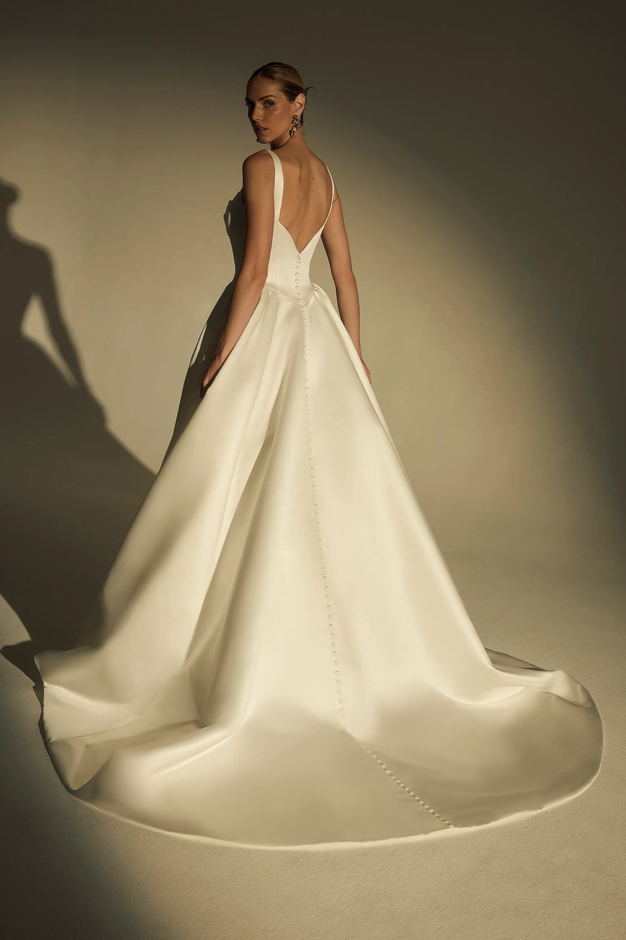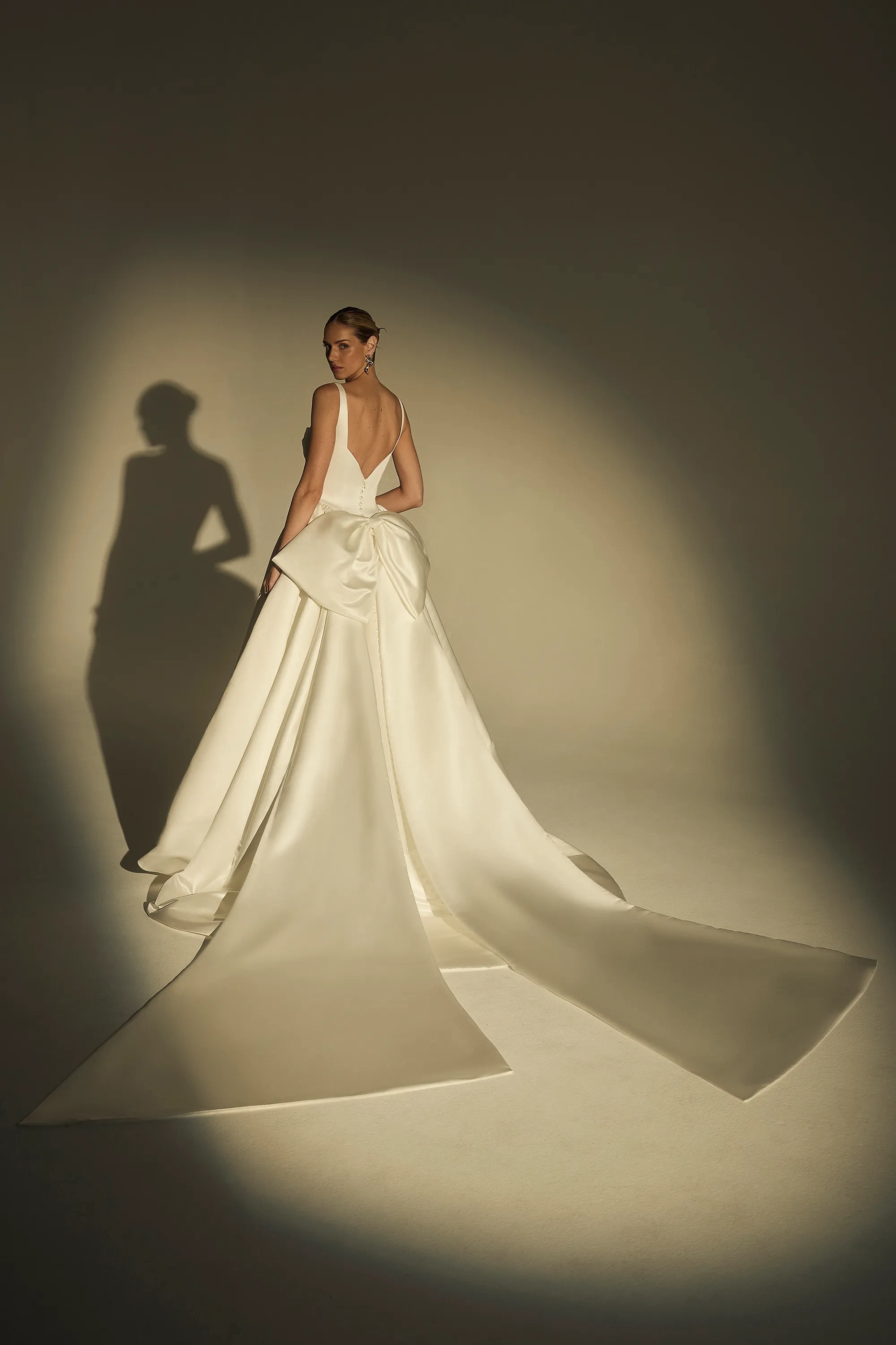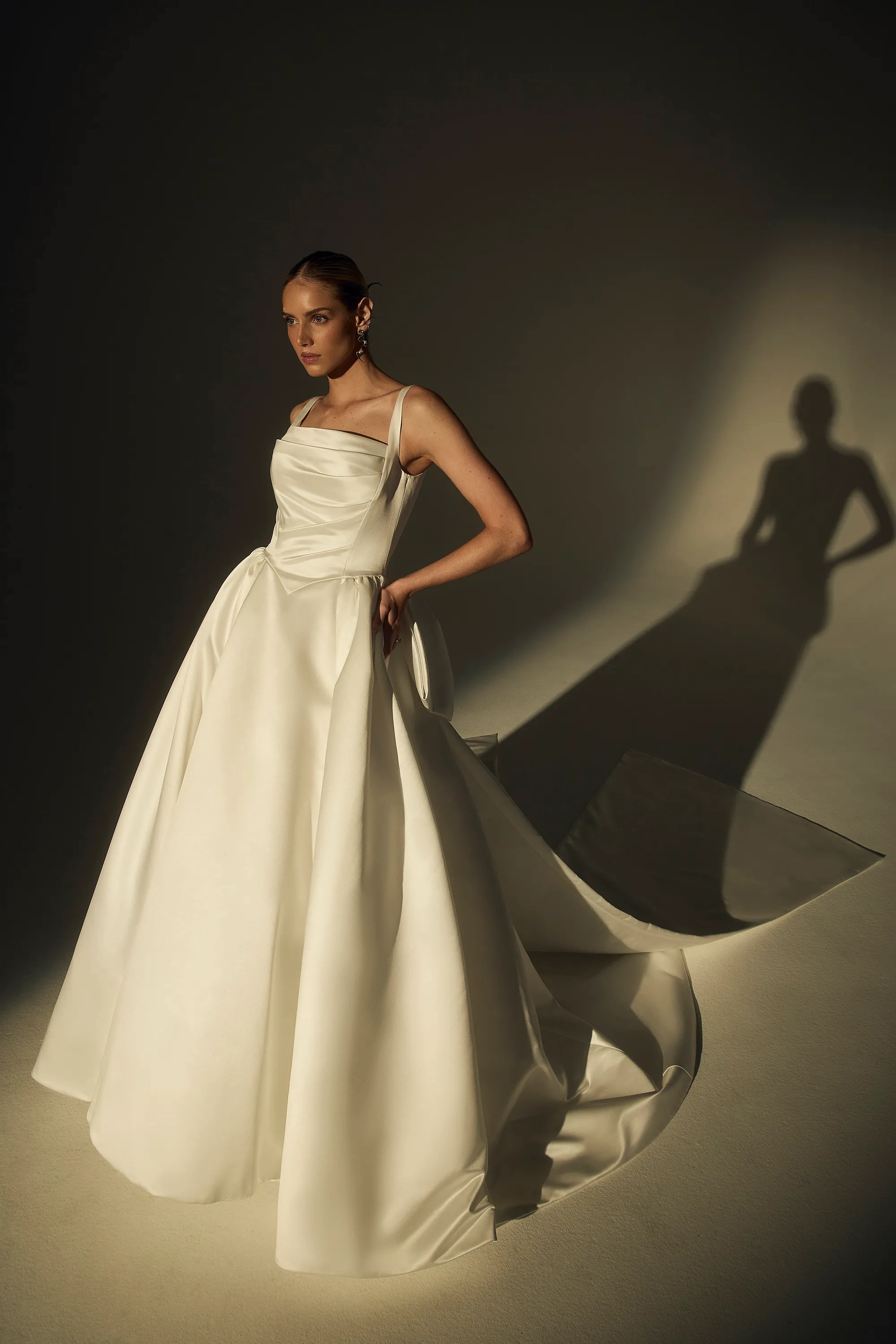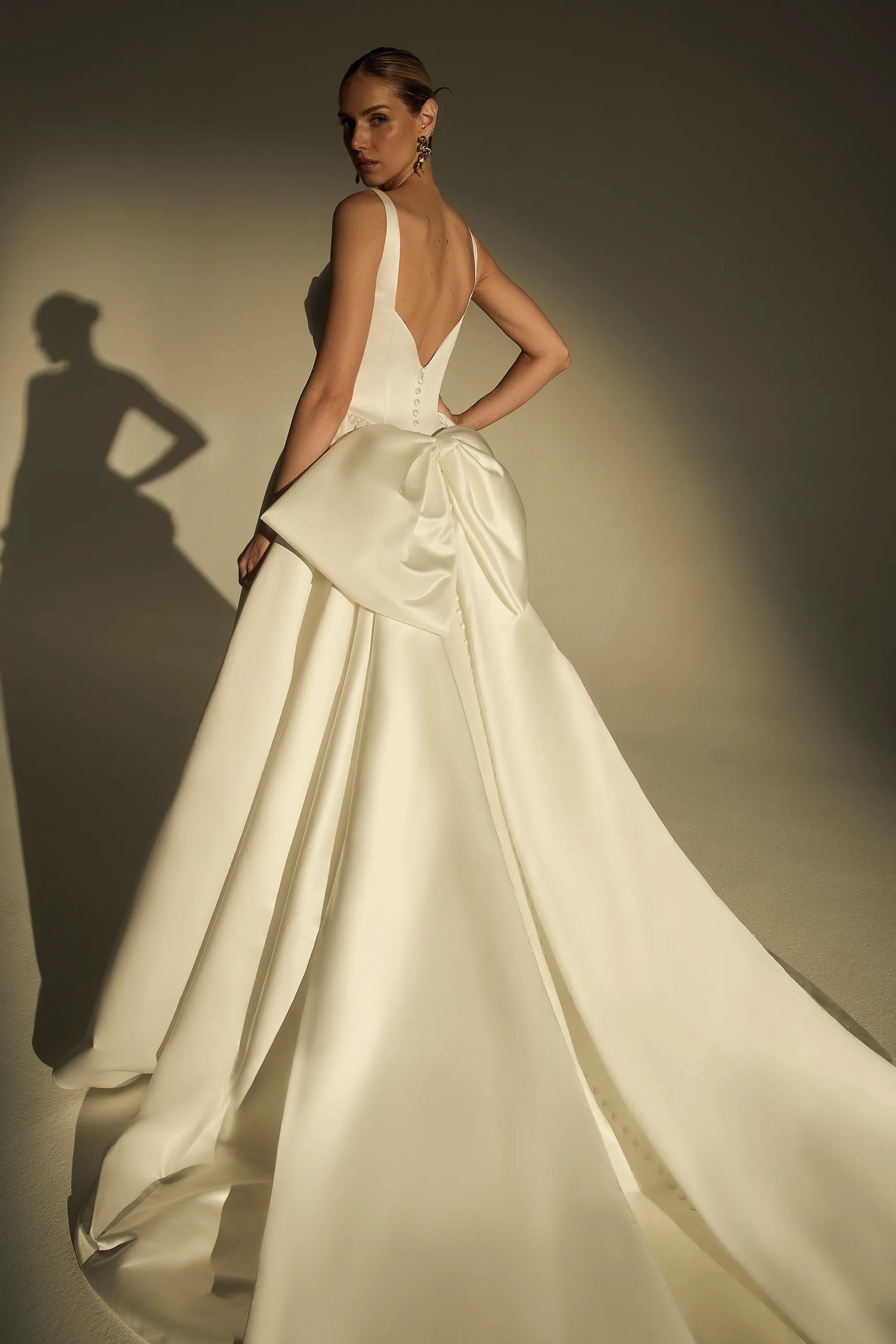 Bold and breathtaking, LE173 Mona is a Mikado ball gown designed for the bride who commands every room she enters. A straight-across neckline and wide tank straps frame the shoulders, while the ruched bodice flows seamlessly into a defined Basque waistline that sculpts the torso with refined precision. Crafted from shimmering satin, the silhouette catches the light beautifully, and a trail of covered buttons cascades down the cathedral-length train for a timeless bridal finish. For a couture-worthy statement, the oversized detachable bow (BOW006) transforms the gown into a regal masterpiece with sweeping royal flair. Glamorous, unforgettable, and distinctly modern, Mona is made for the bride who dares to stand out.
