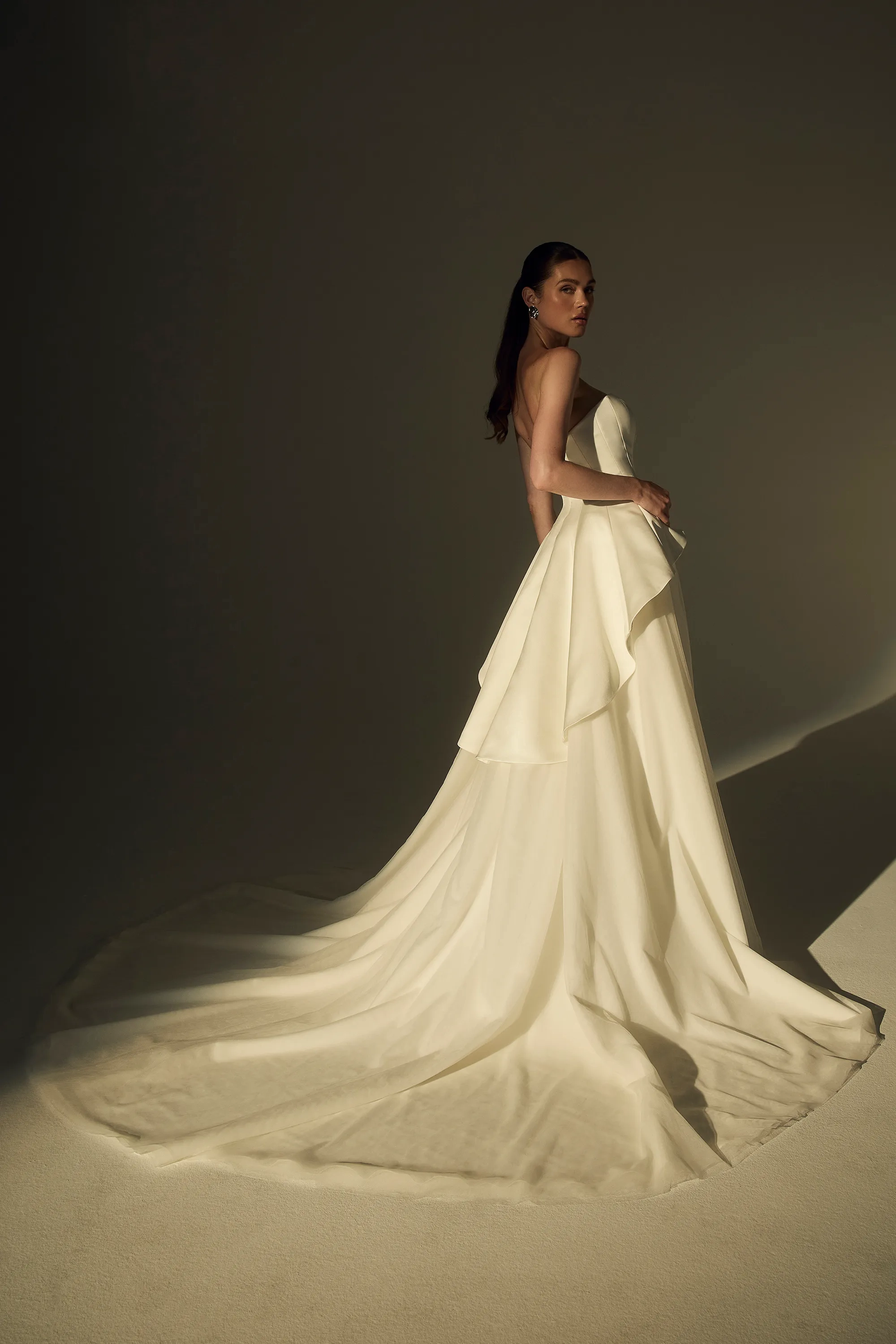 Own the aisle in LE174 Josiane, a two-piece bridal look that fuses couture edge with timeless elegance. The strapless bodice features a modified sweetheart neckline and sculptural contouring seams, creating a clean, flattering silhouette. At the back, a dramatic tuxedo-inspired peplum adds architectural intrigue, while a detachable silk tulle skirt softens the look with airy movement, offering a striking contrast to the structured top. Finished with a sweeping 109-inch royal cathedral train, this dynamic design is made for the fashion-forward bride who values versatility, artistry, and unforgettable presence.